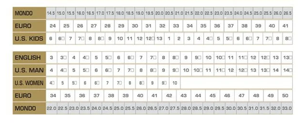 Om de maten van skibotten beter te begrijpen, vindt u hieronder een tabel met wereldwijde schoenmaten.